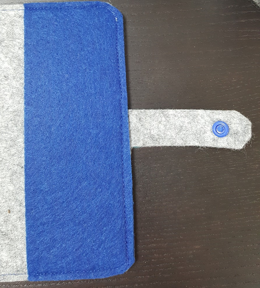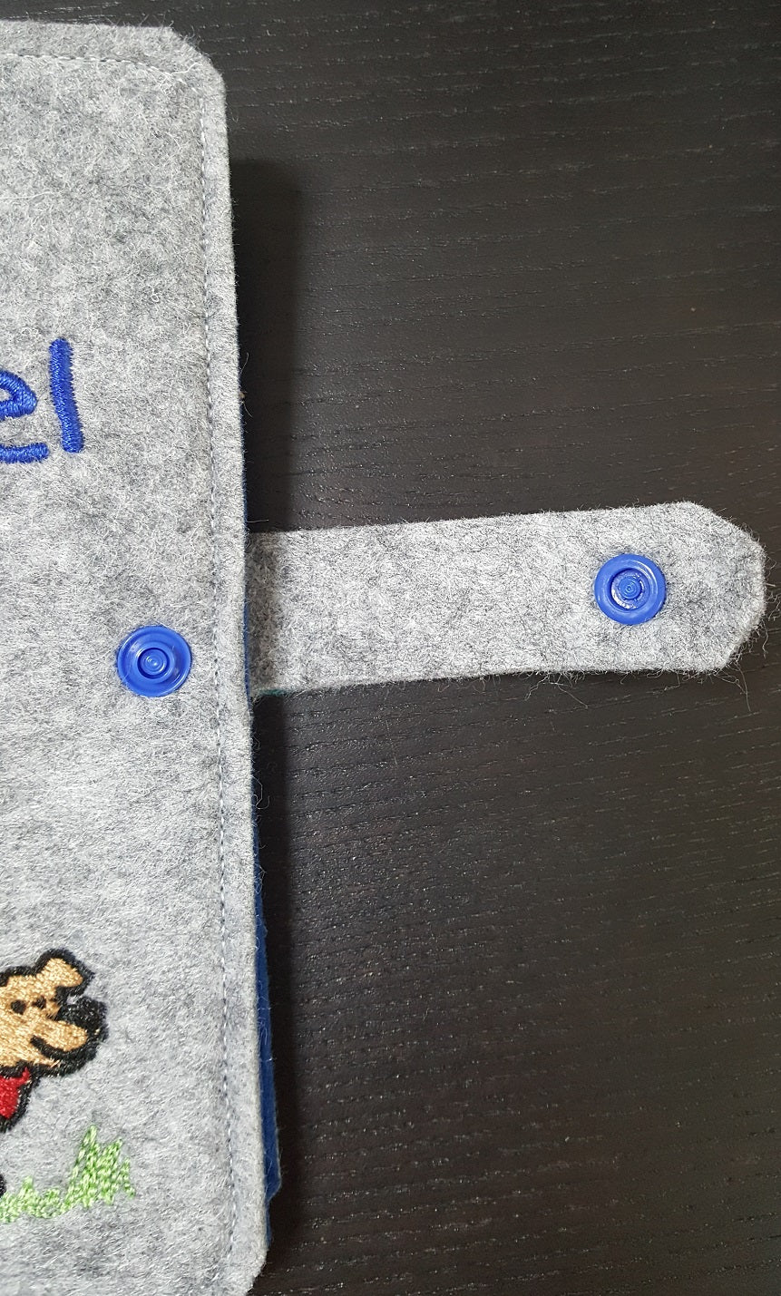 Mit einer eingenähten Lasche und einem Druckknopf lässt die Hülle sich verschließen und schützt so eure Neue Bibel.
