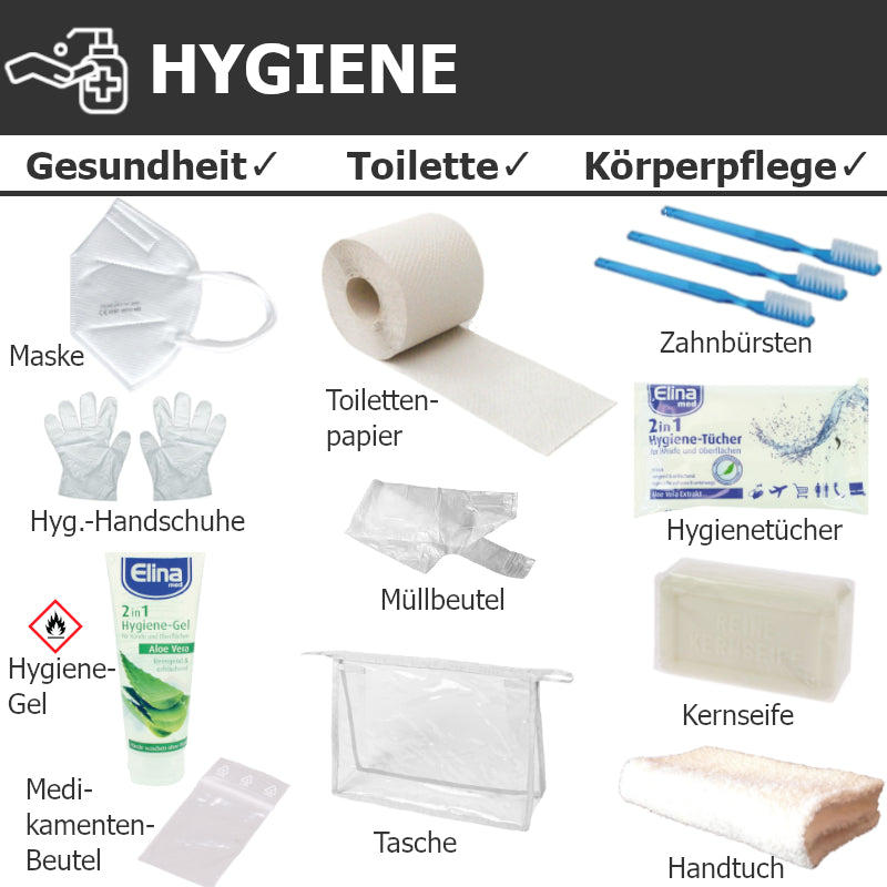 - Hygienetücher (zum Reinigen von Hände, Gesicht und Körper geeignet)