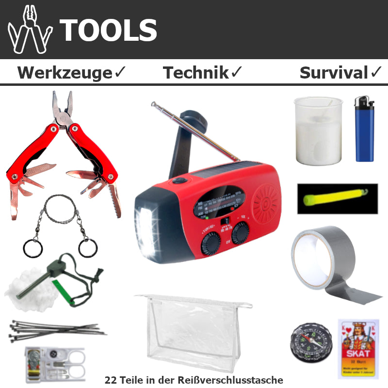 Beutel: Verpflegungs-Set, Schutz-Set, Hygiene-Set, Tools-Set, Dokumentenschutz-Set, Erste-Hilfe-Set