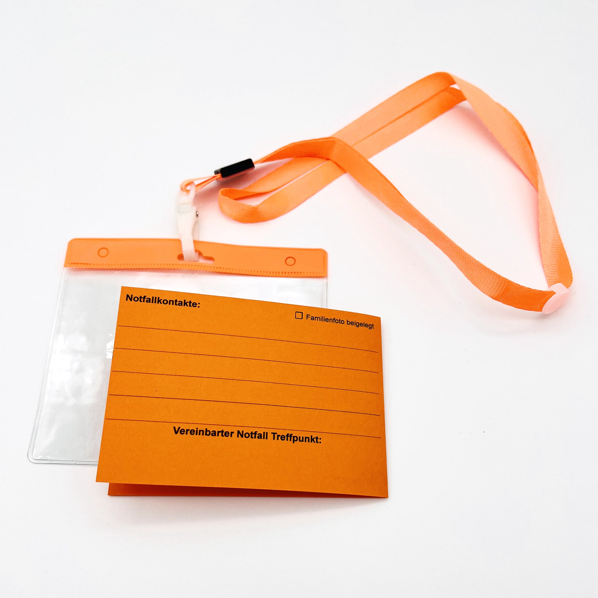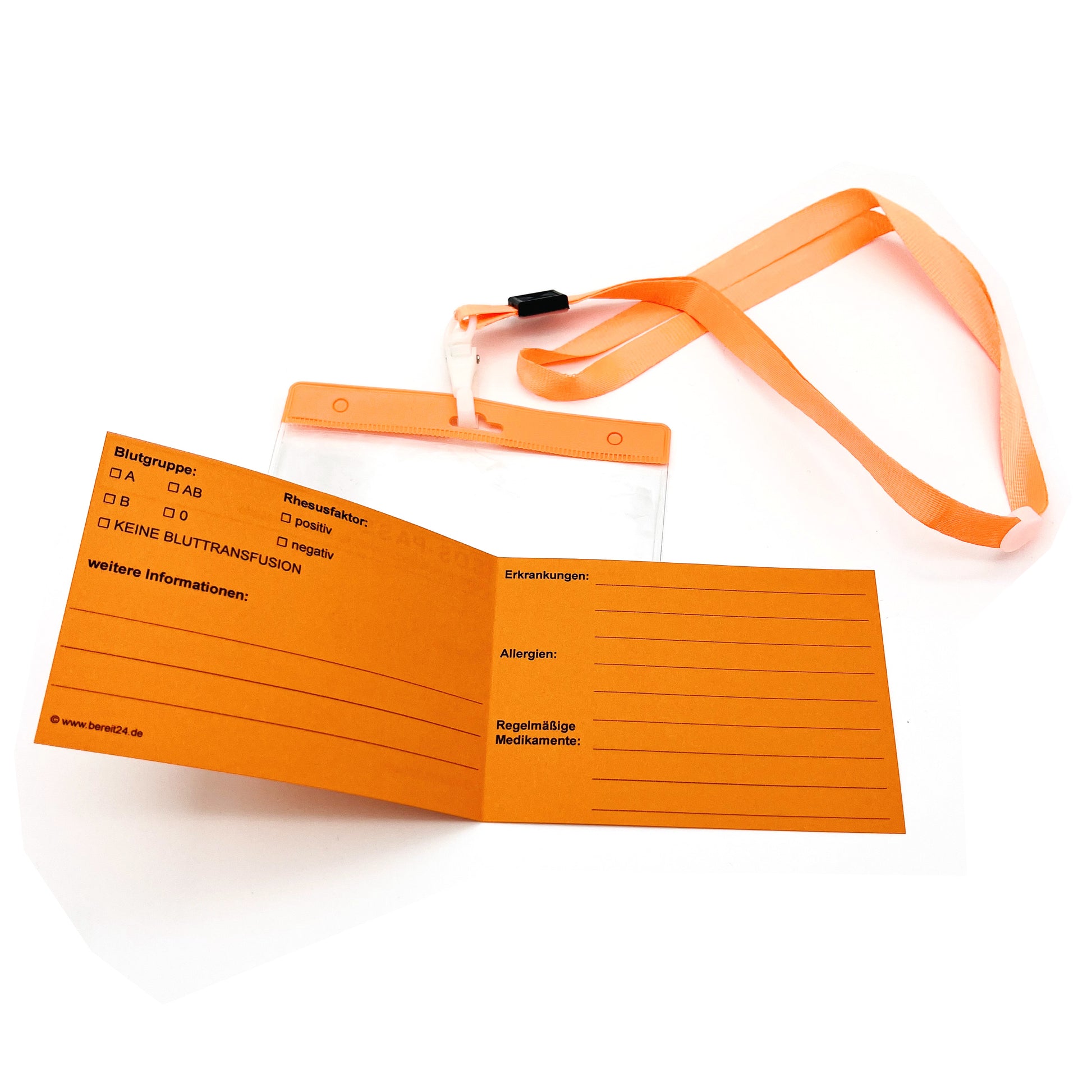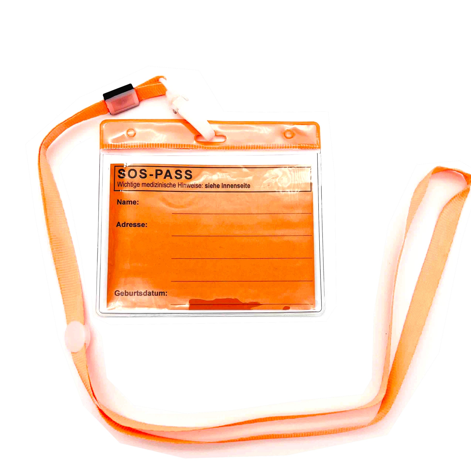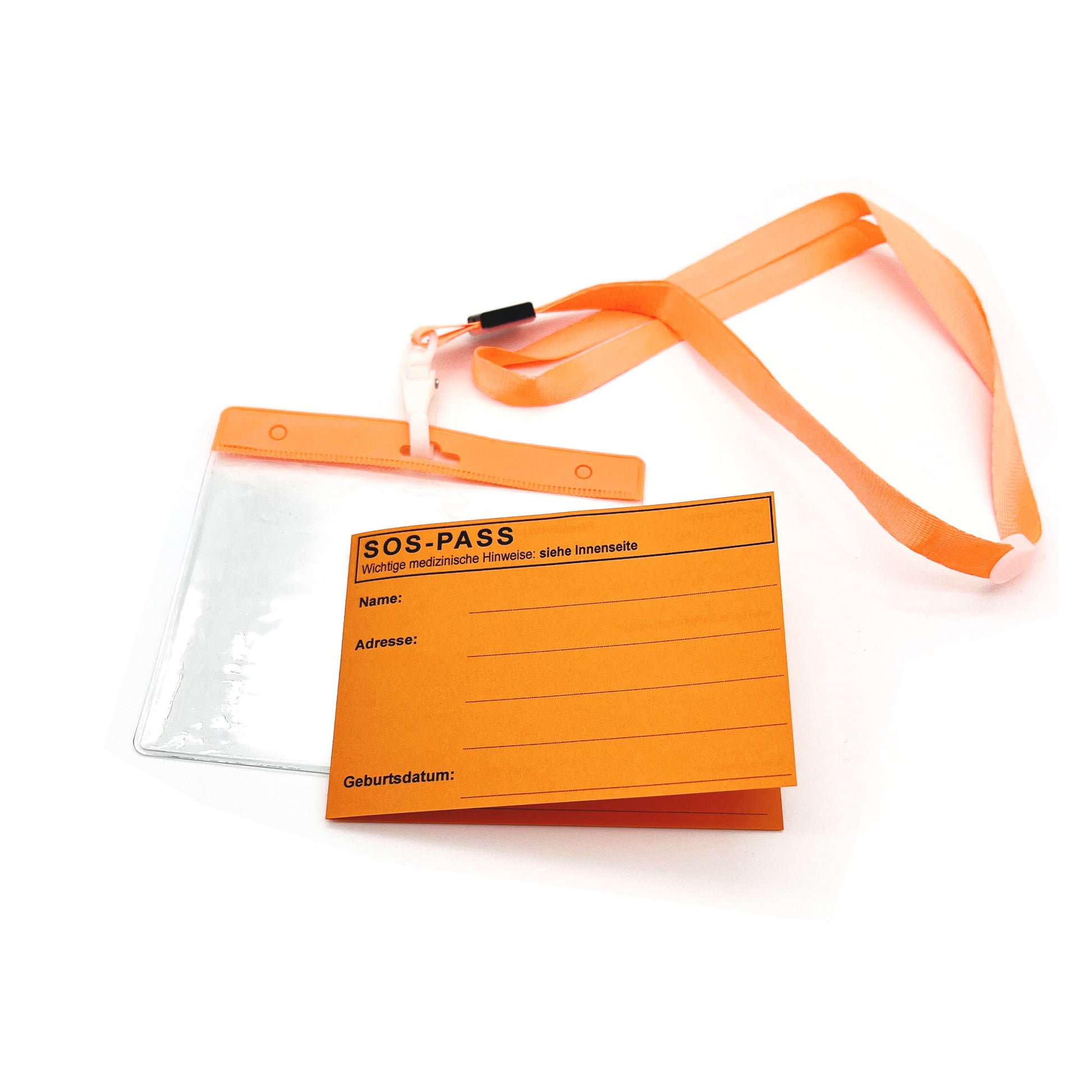 SOS-Pass in auffallender organger Hülle und Umhänge-Band. So ein Ausweis kann Leben retten, falls man im Notfall gefunden wird, sich selbst aber nicht verständigen kann.